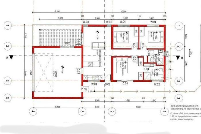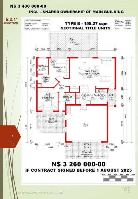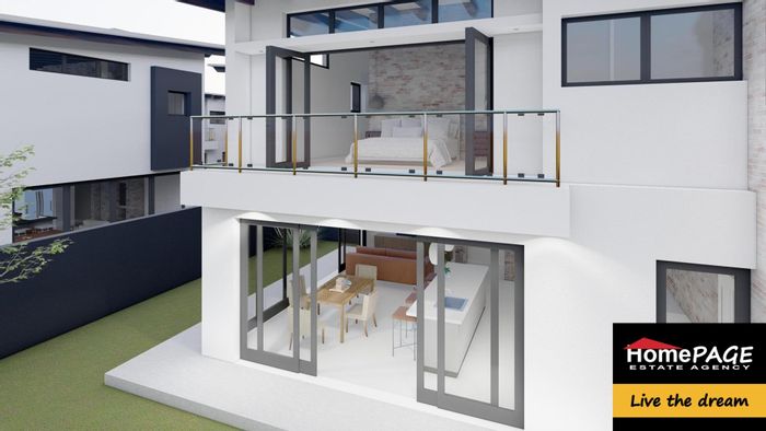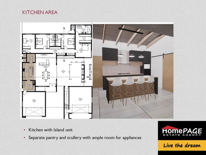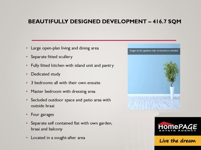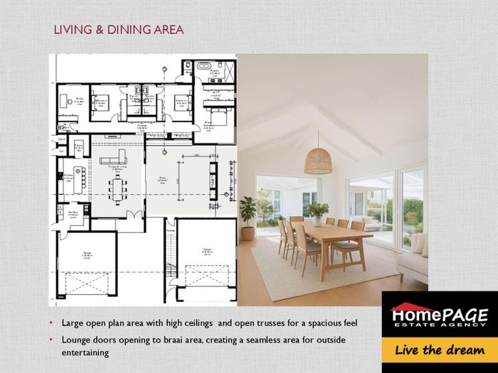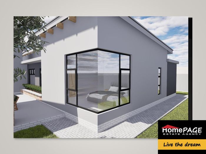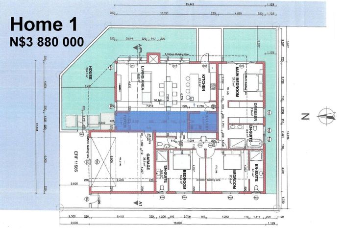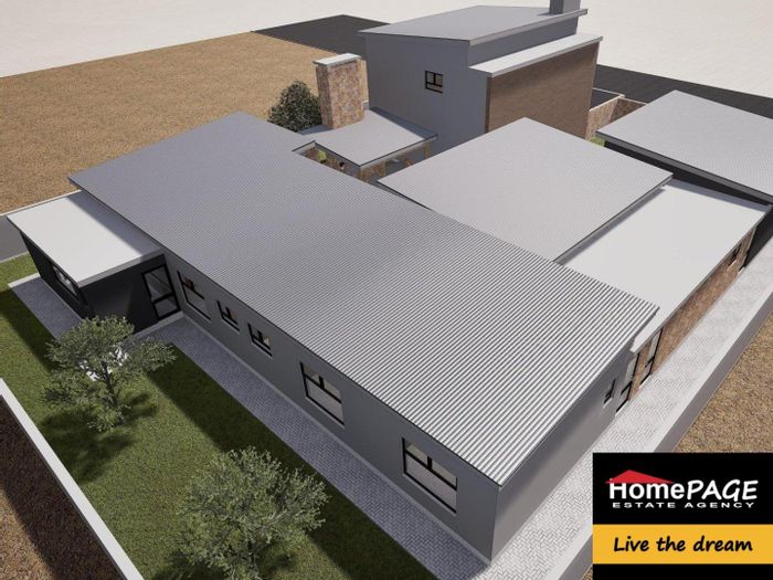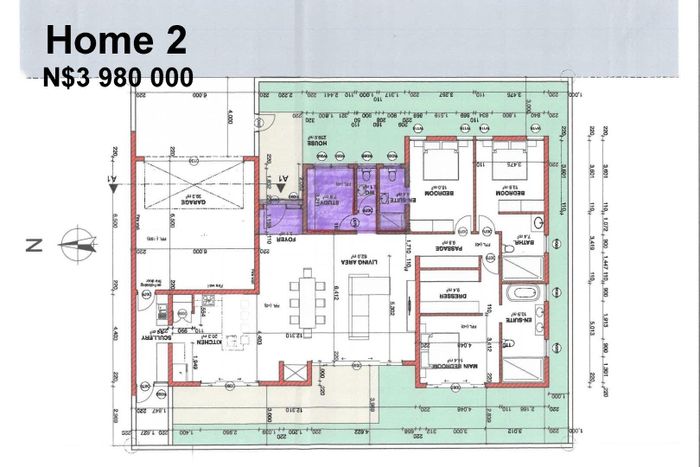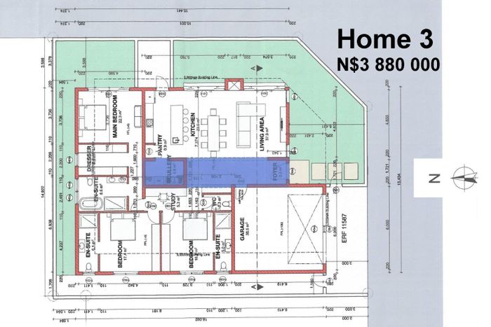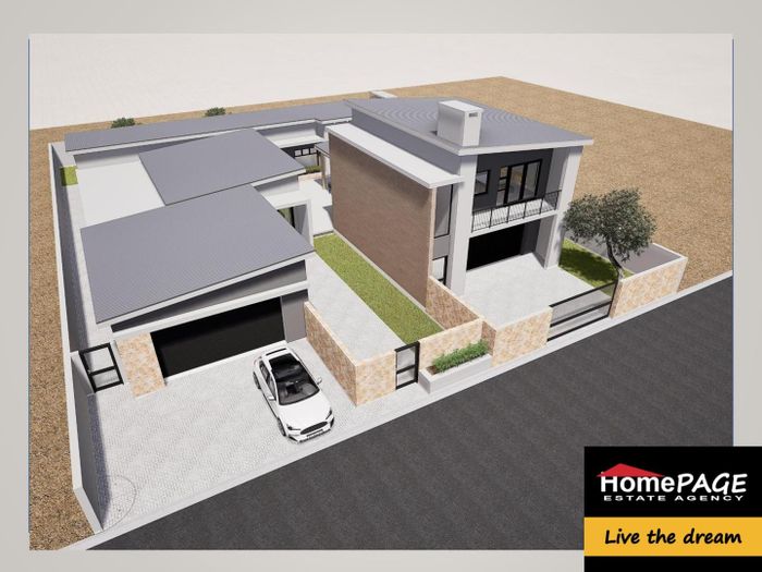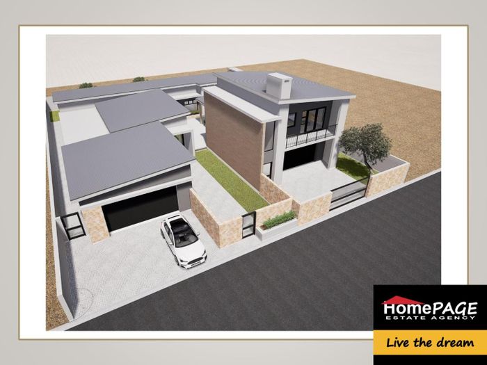 Three-bedroom home with open-plan living, potential for extra garages or flat, large yard, and double garage. Price: N$2 480 000.