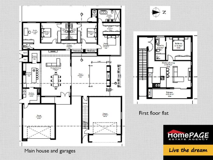 Five-bedroom en-suite home with guest room, flat, office space, and extensive garage facilities on a secure garden property.