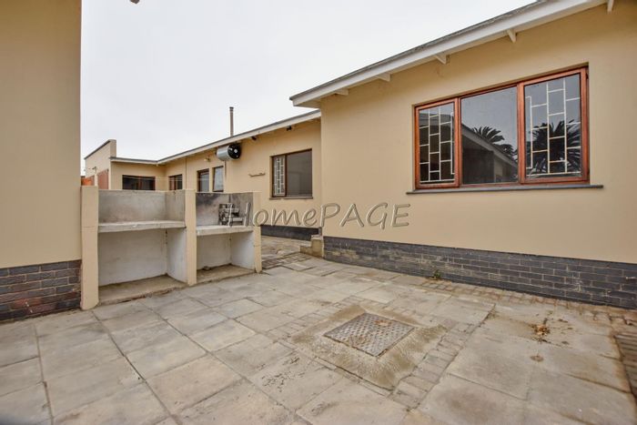 5 bedr home with 2 bedr flat in Swakopmund. Office rights, fireplace, security features, garden shed, and ample space.