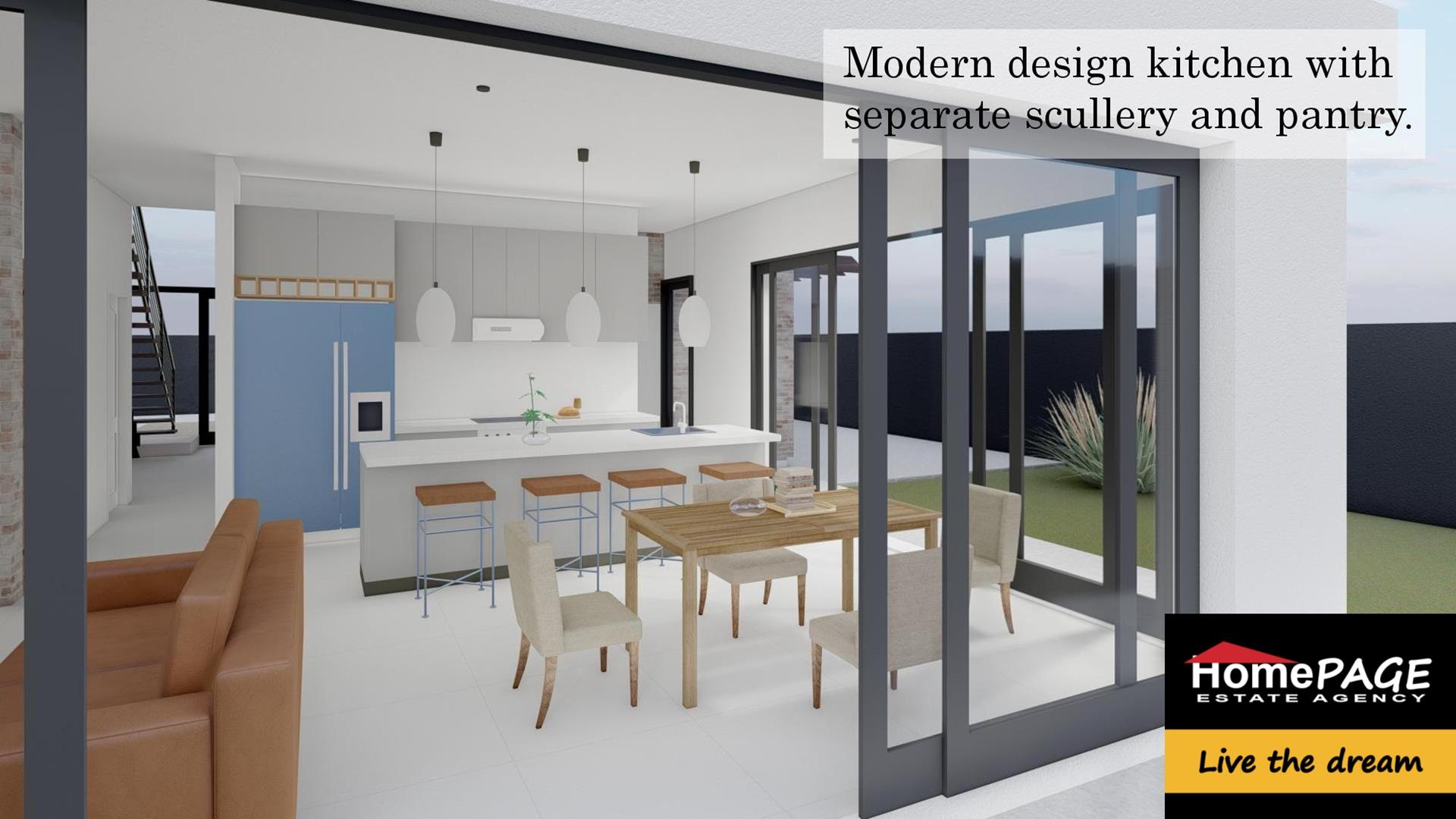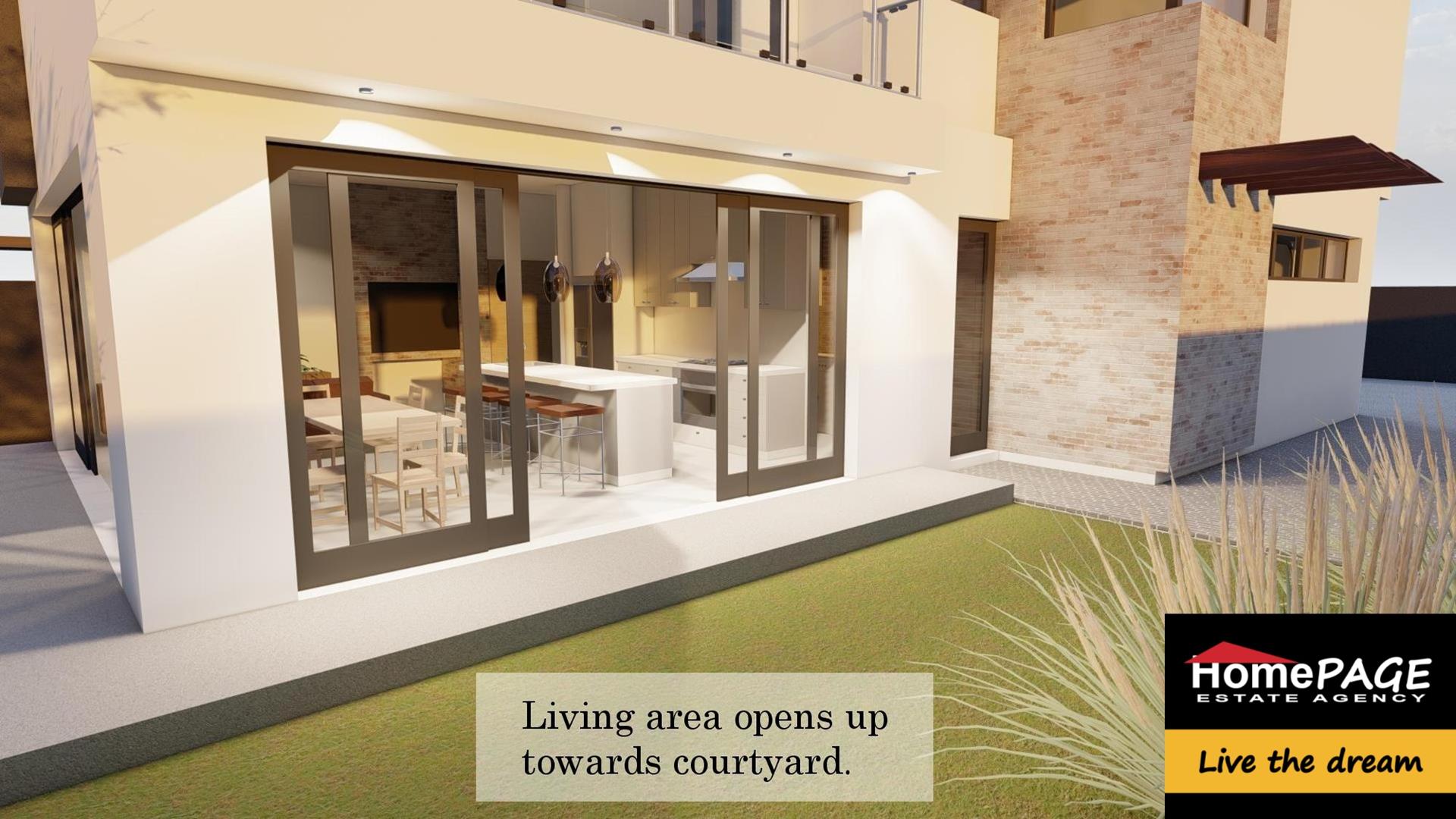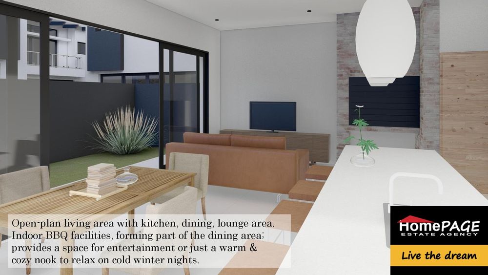 * Living area, catering for lounge and dining room (with indoor BBQ), open plan with kitchen