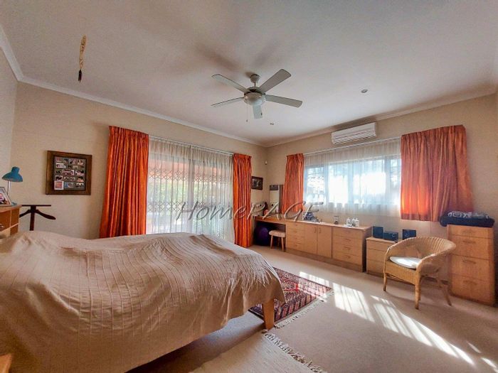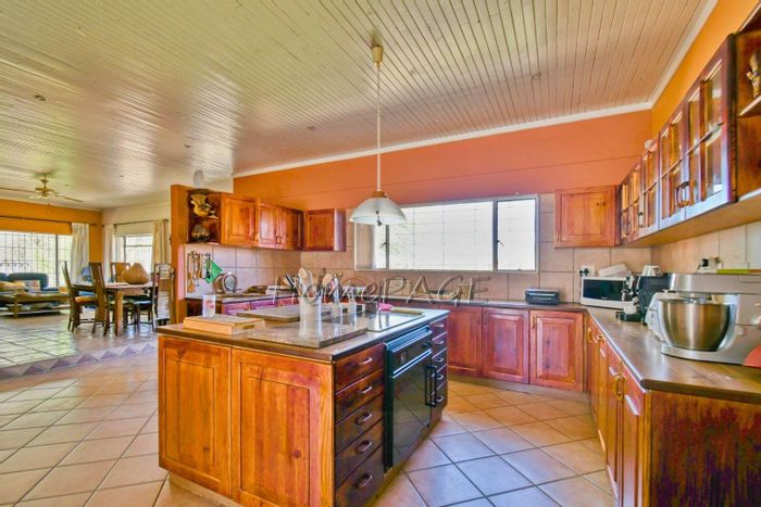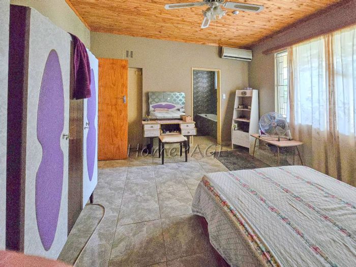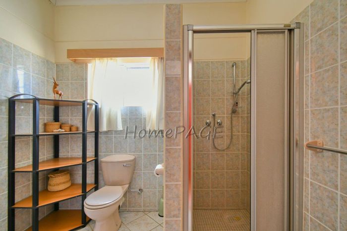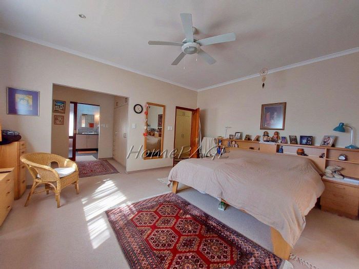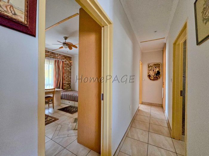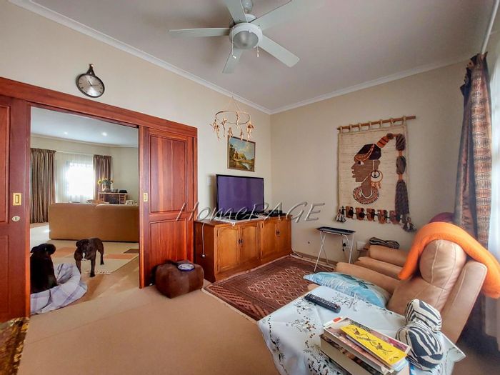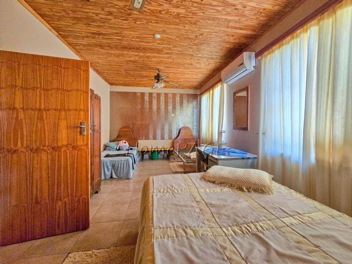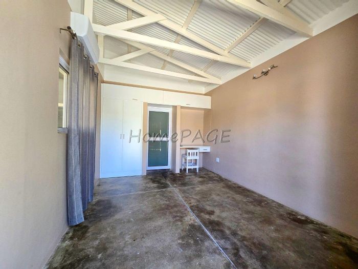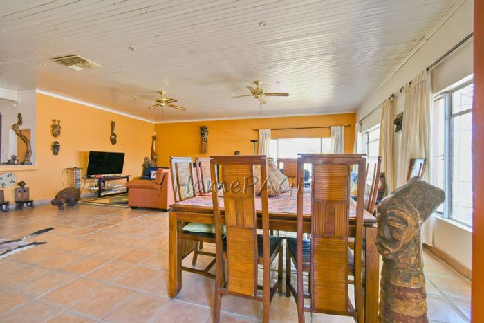 Spacious property with main home, two flats, outbuildings, large garden, solar system, and security features, priced at N$4,725,000.