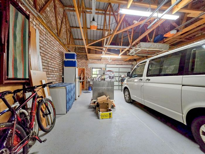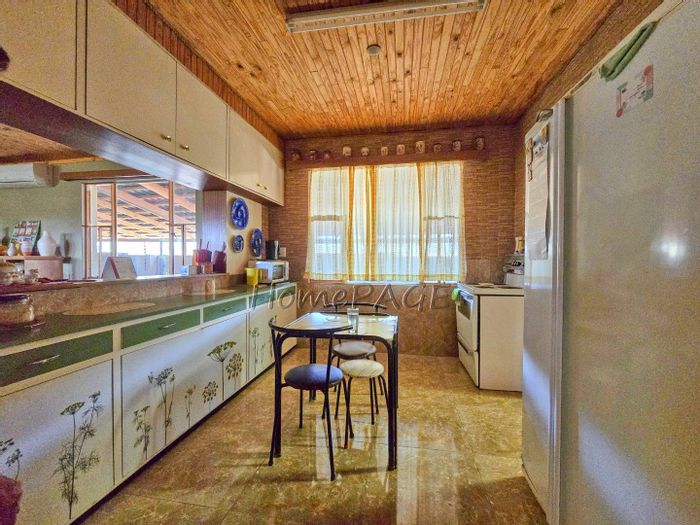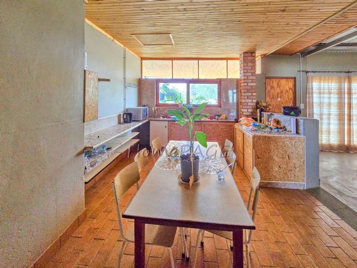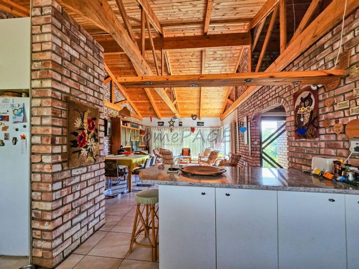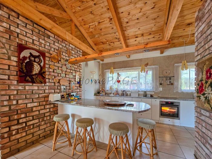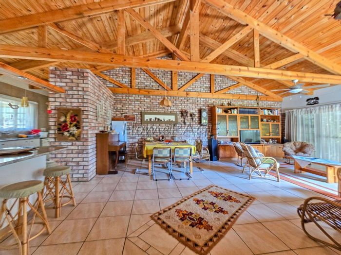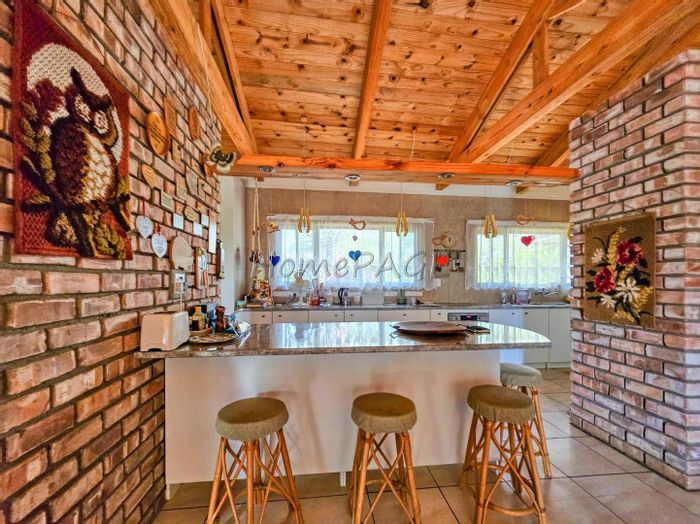 Entertainer's haven with indoor BBQ and large pizza oven, exposed trusses and low-maintenance Uis-brick construction on a spacious erf — open-plan kitchen with island, four bedrooms, double garage.