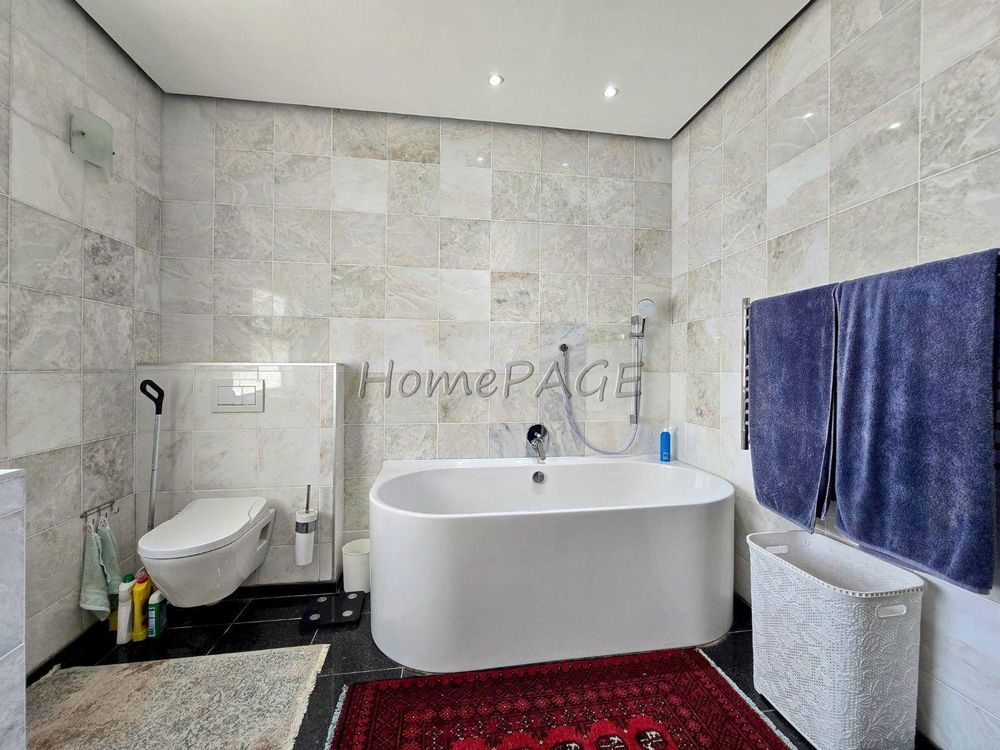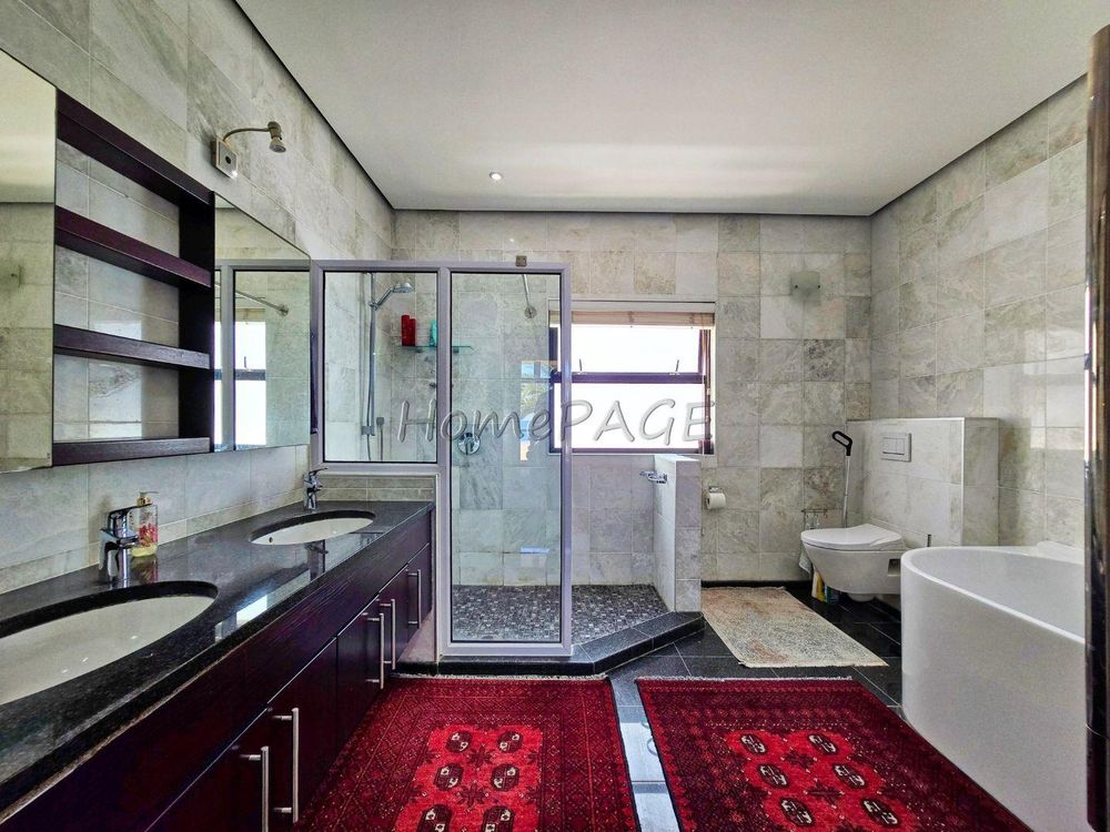 * Elaborate bathroom with marble tiles, granite tops, bath, shower, double basins, toilet and urinal