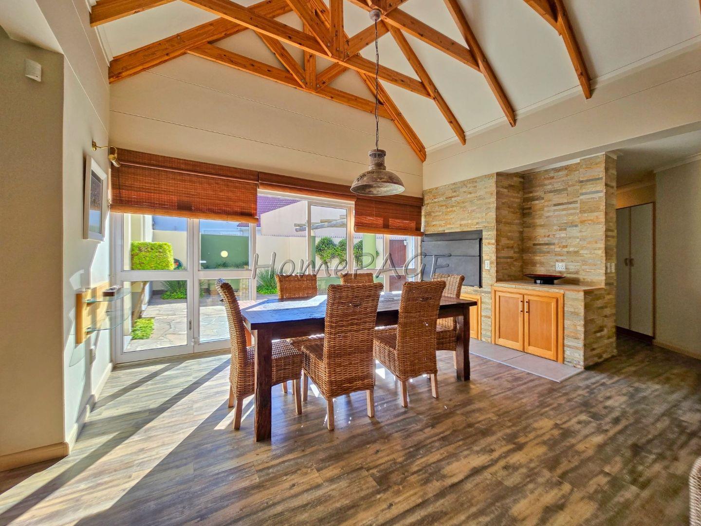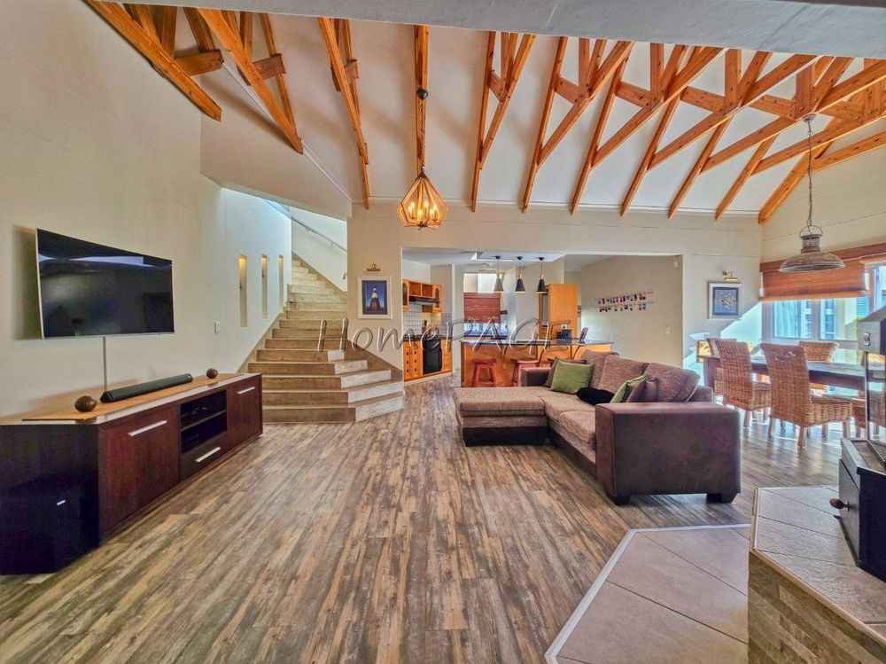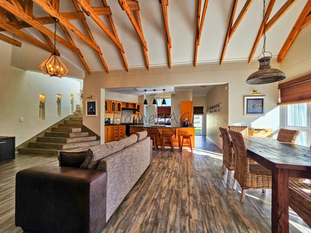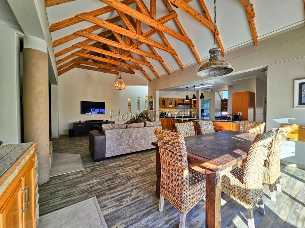 * Living area, with exposed wood trusses, catering for lounge/TV room and dining/bbq room (indoor BBQ)