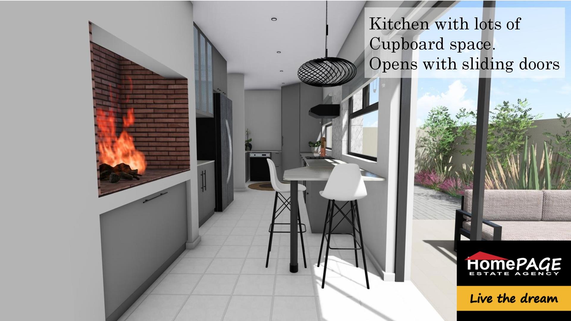 * Kitchen with lot of cupboard space, opens with sliding doors to garden/patio