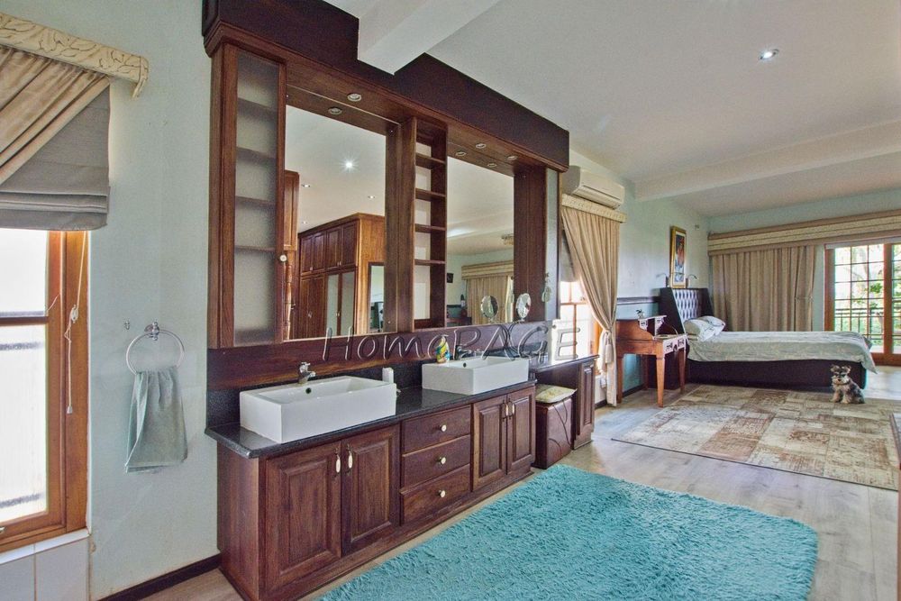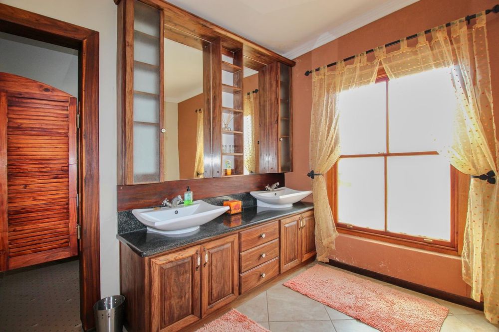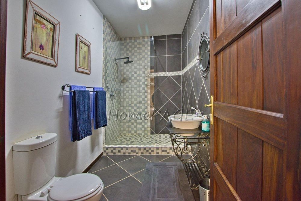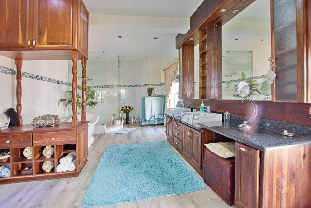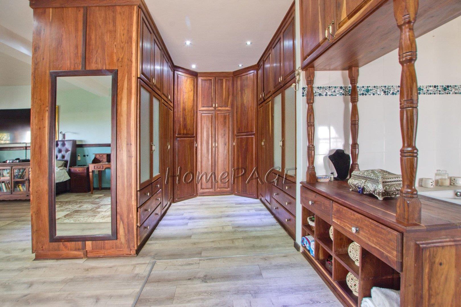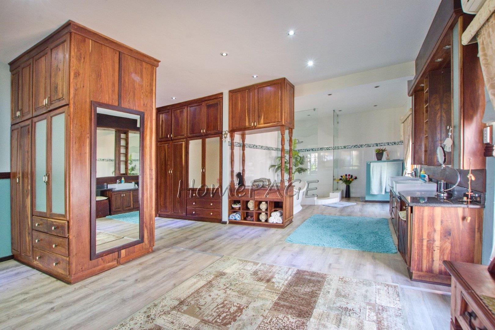 The main bedroom-suite with large wooden sliding doors and a balcony overseeing the beautiful garden and mountain vista has a walk-in wardrobe fitted with wood-crafted cupboards and a huge open en-suite bathroom with bath, shower, toilet and double basin and wood-crafted vanity and air conditioning.