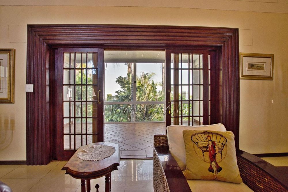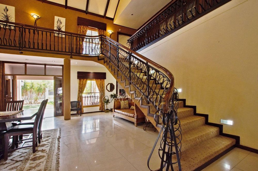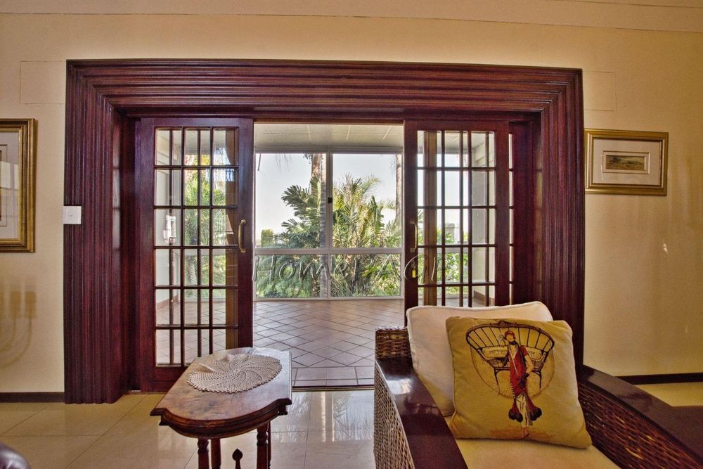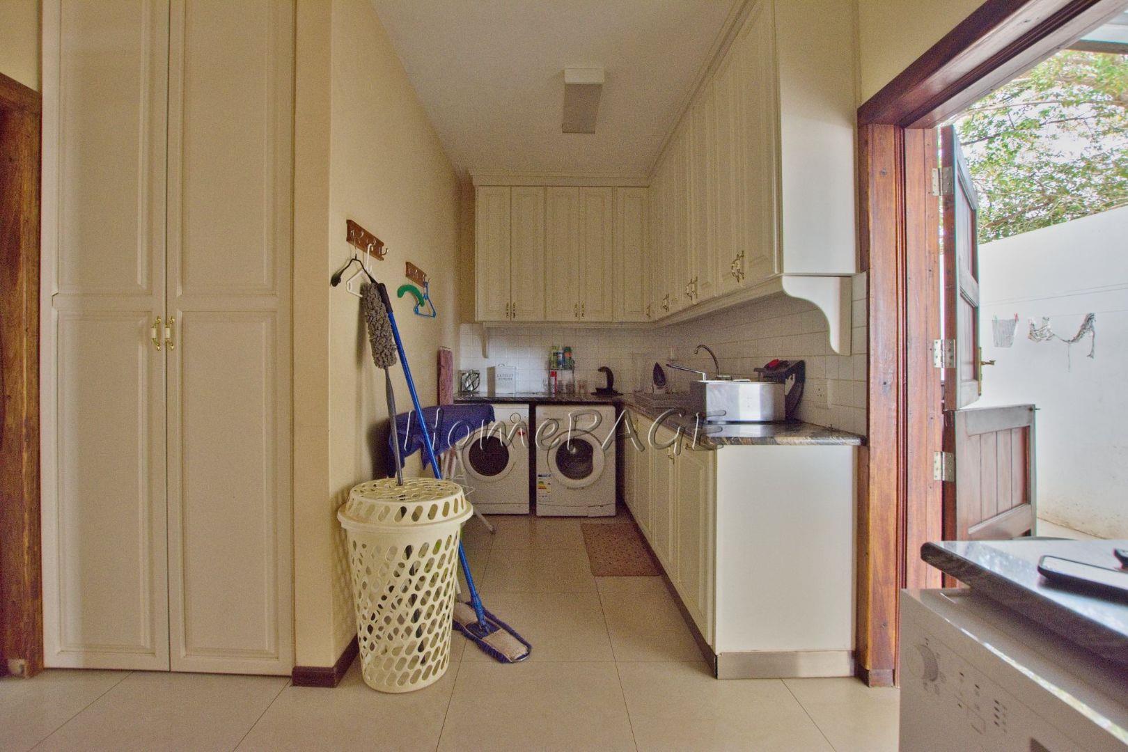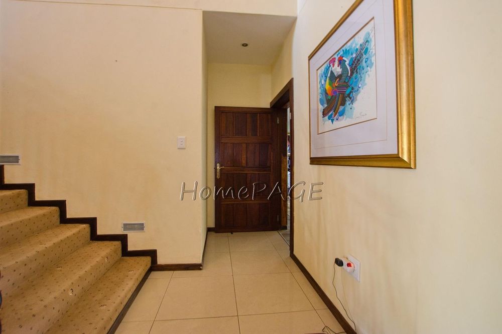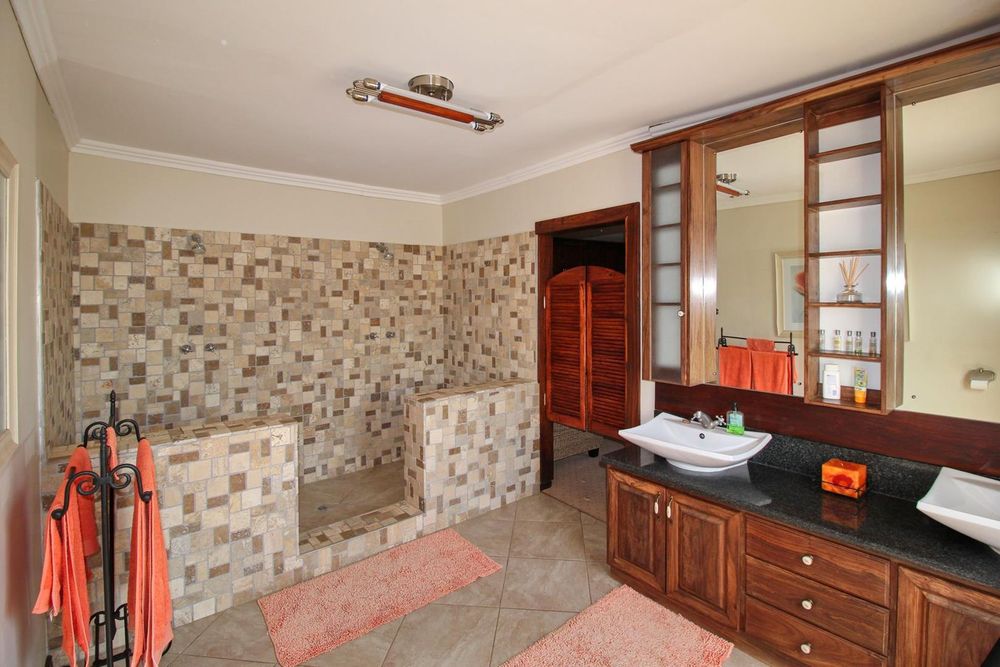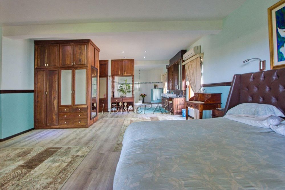 The main bedroom-suite with large wooden sliding doors and a balcony overseeing the beautiful garden and mountain vista has a walk-in wardrobe fitted with wood-crafted cupboards and a huge open en-suite bathroom with bath, shower, toilet and double basin and wood-crafted vanity and air conditioning.