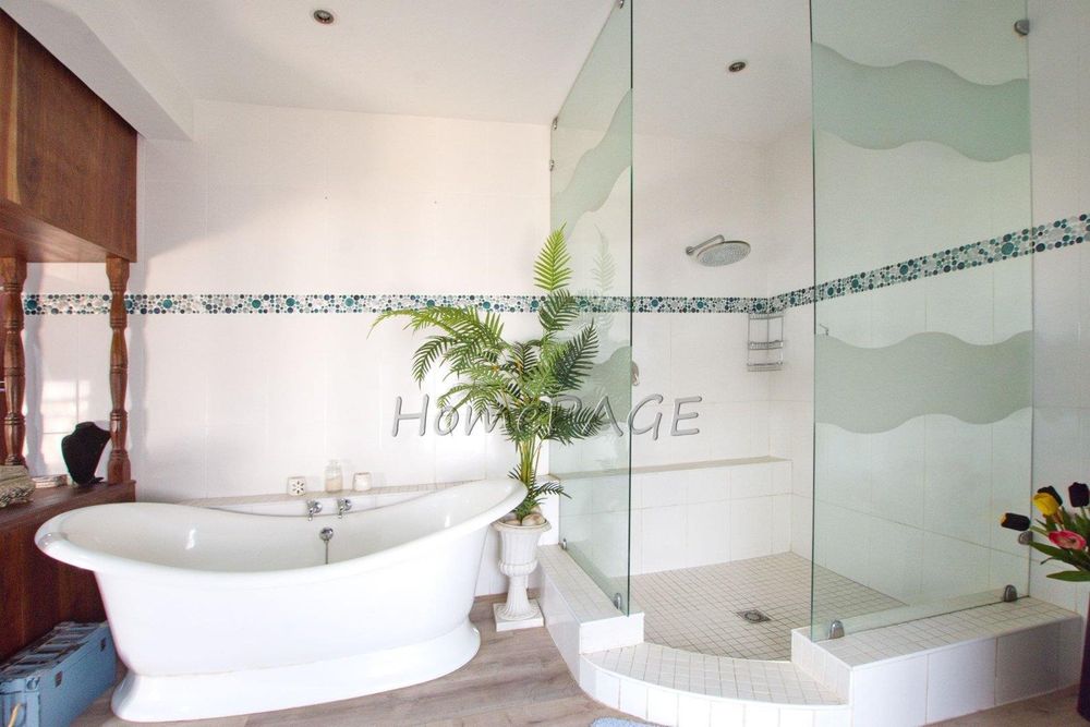- Main Bedroom with en-suite bathroom with bath, shower, toilet, double vanity, and balcony.