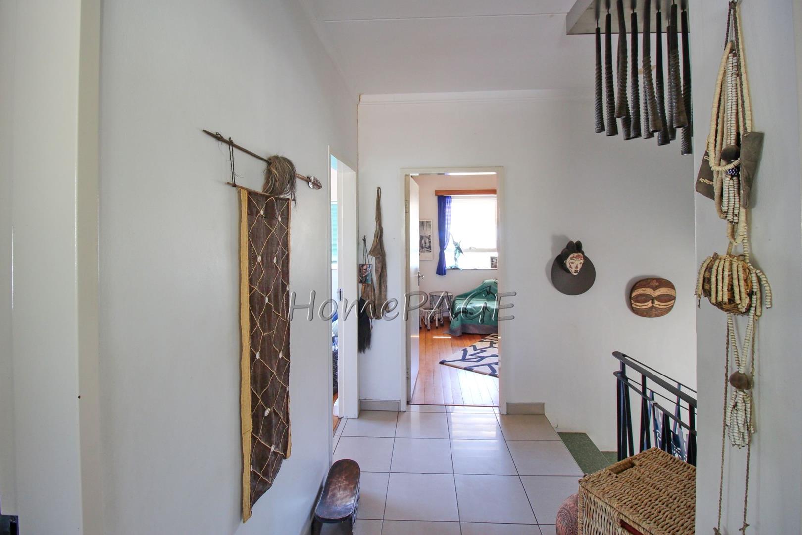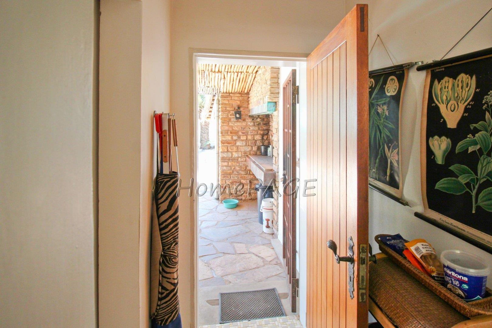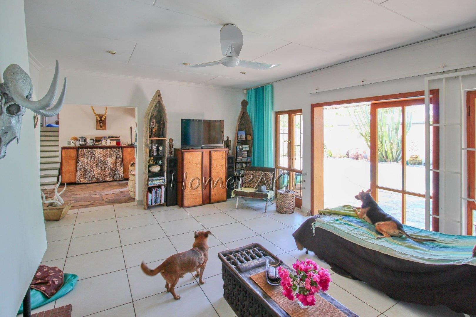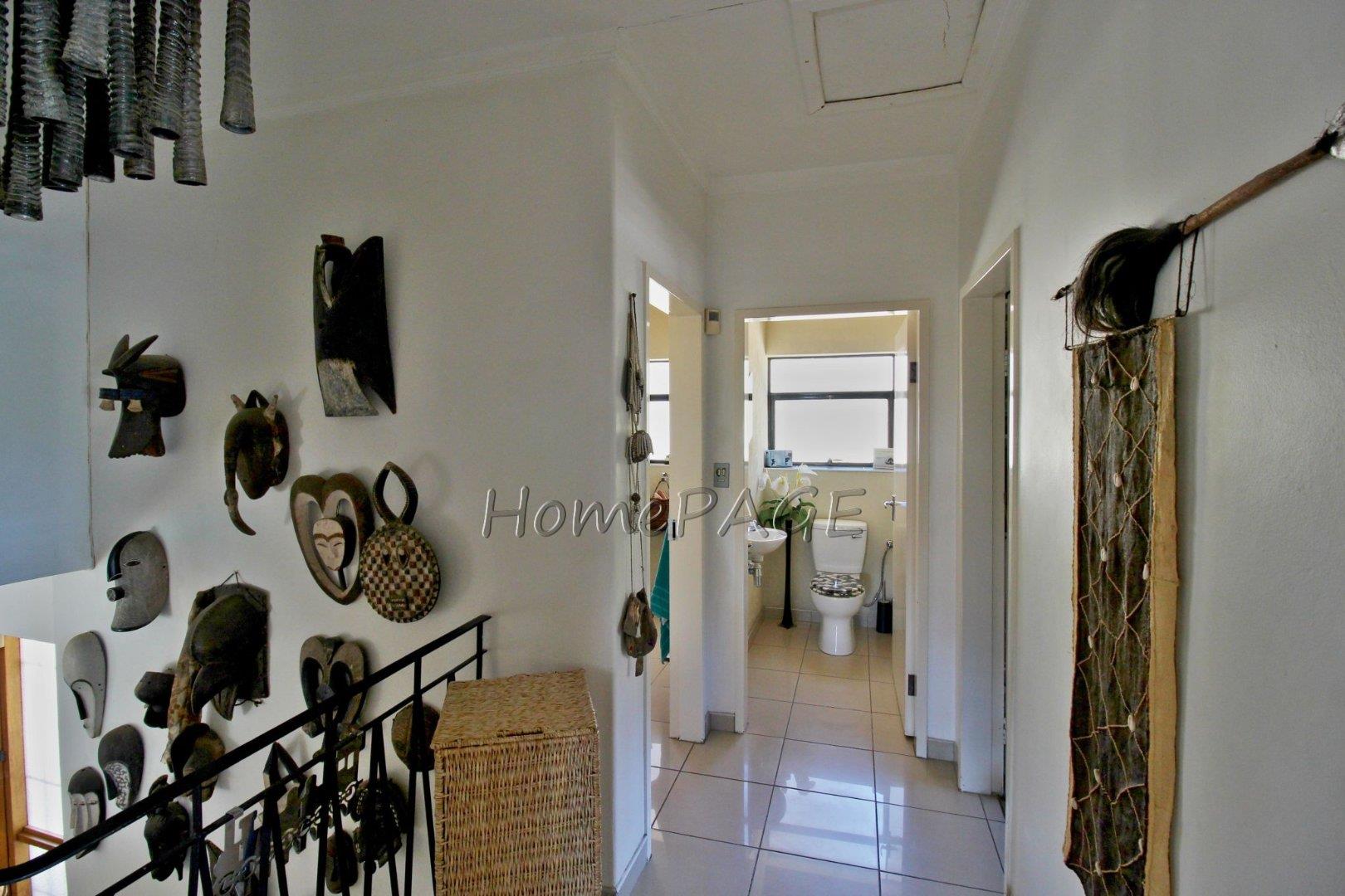 Downstairs is the lounge area leading to the patio with swimming pool. Dining room and small kitchen with scullery leading onto the outside veranda with built-in braai, large entertainment area and thatched roof bar.
