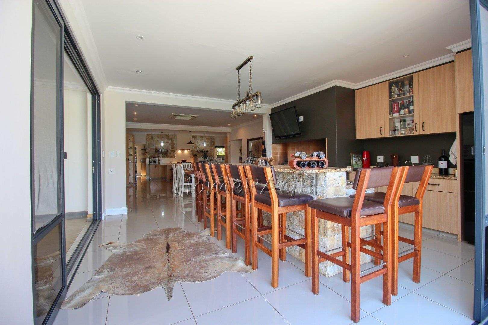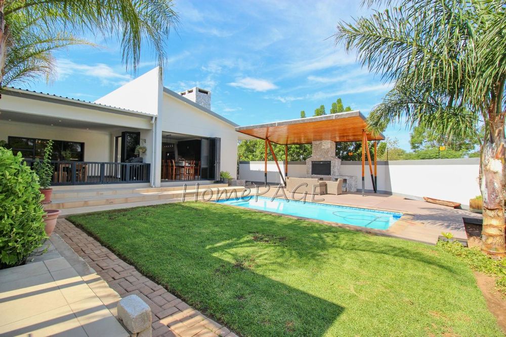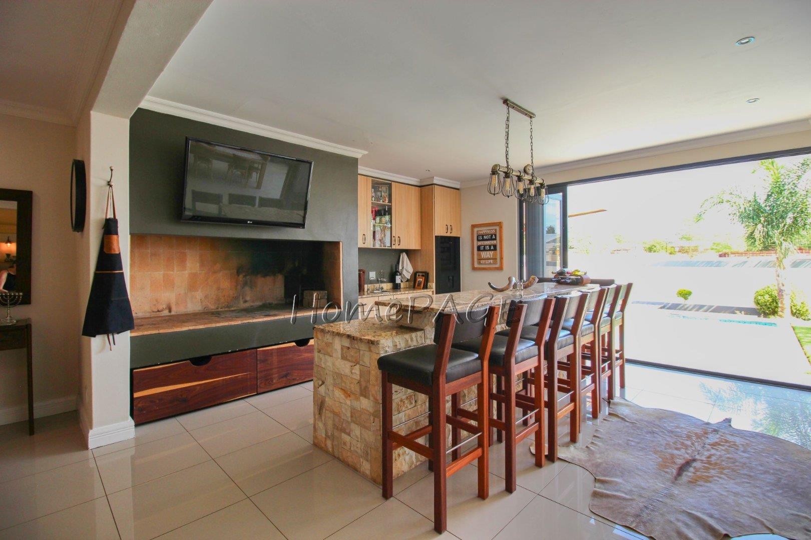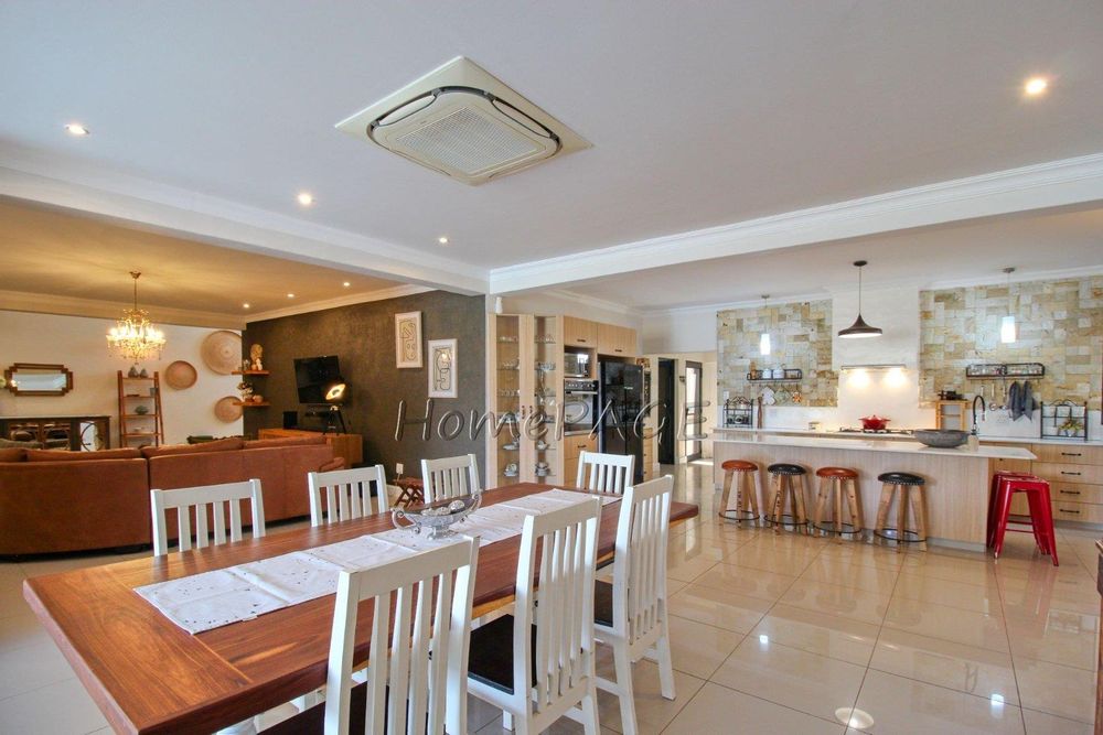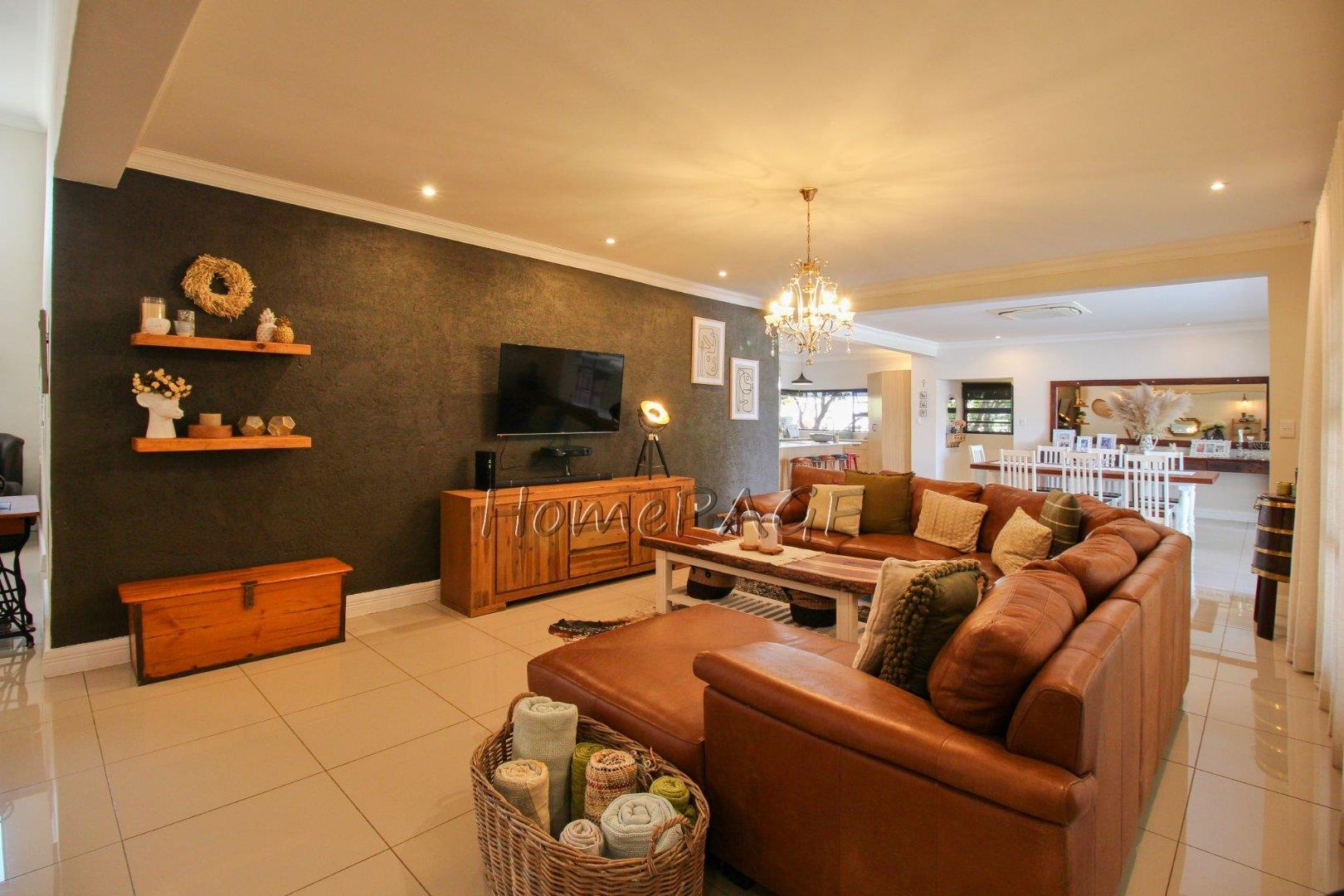 With its spacious open plan, living room, dining room, kitchen and entertainment area with folding doors leading into the beautiful garden with its heated swimming pool, and outside entertainment area with built-in braai.