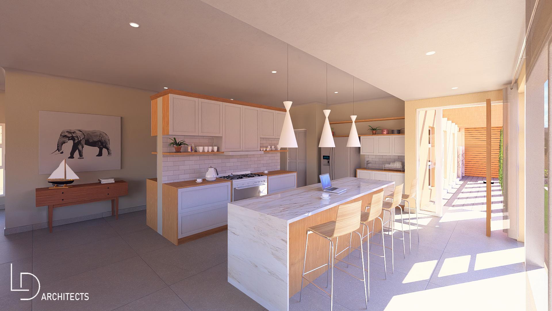 * Kitchen, with island and breakfast nook, open plan with living area