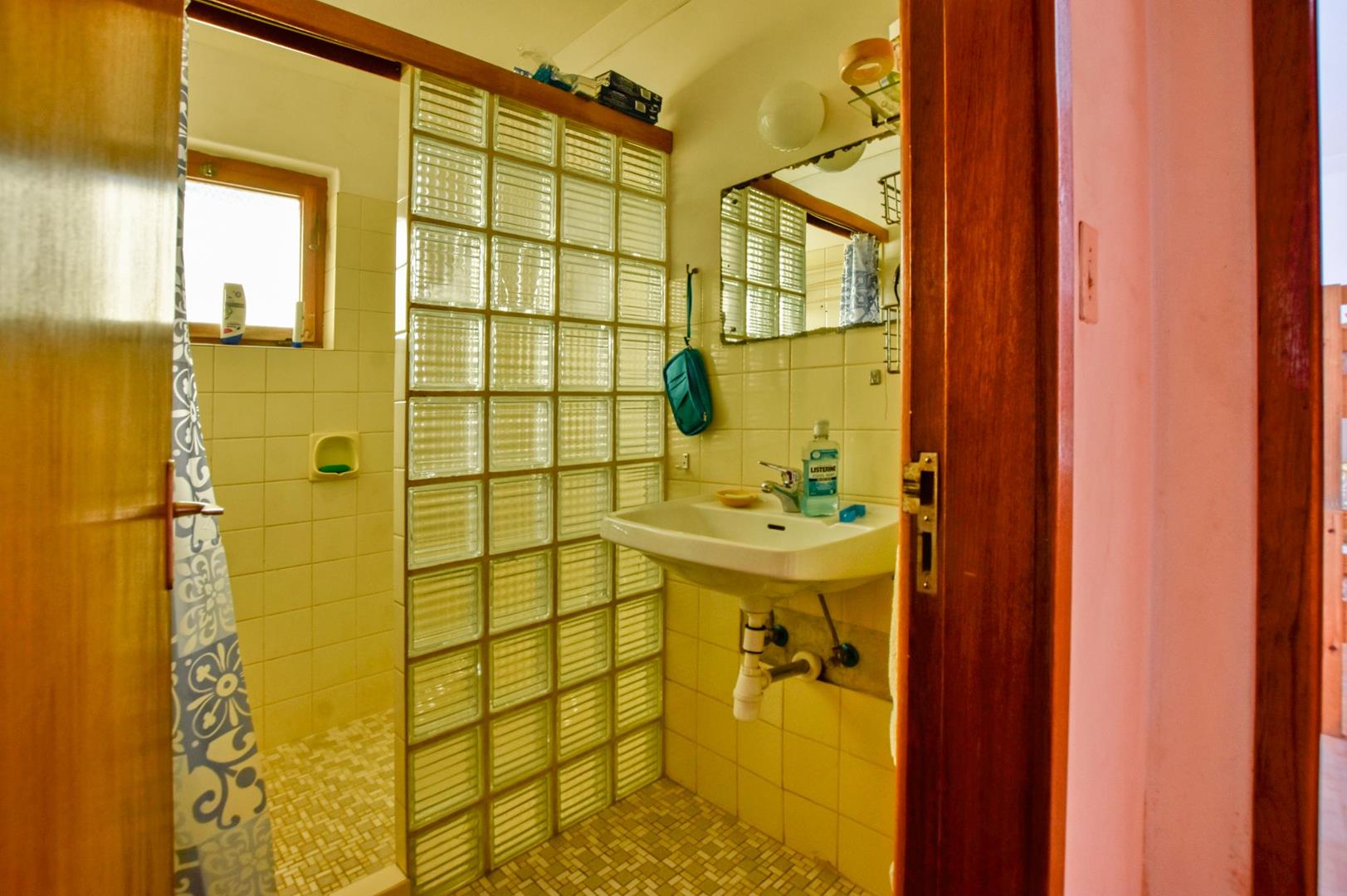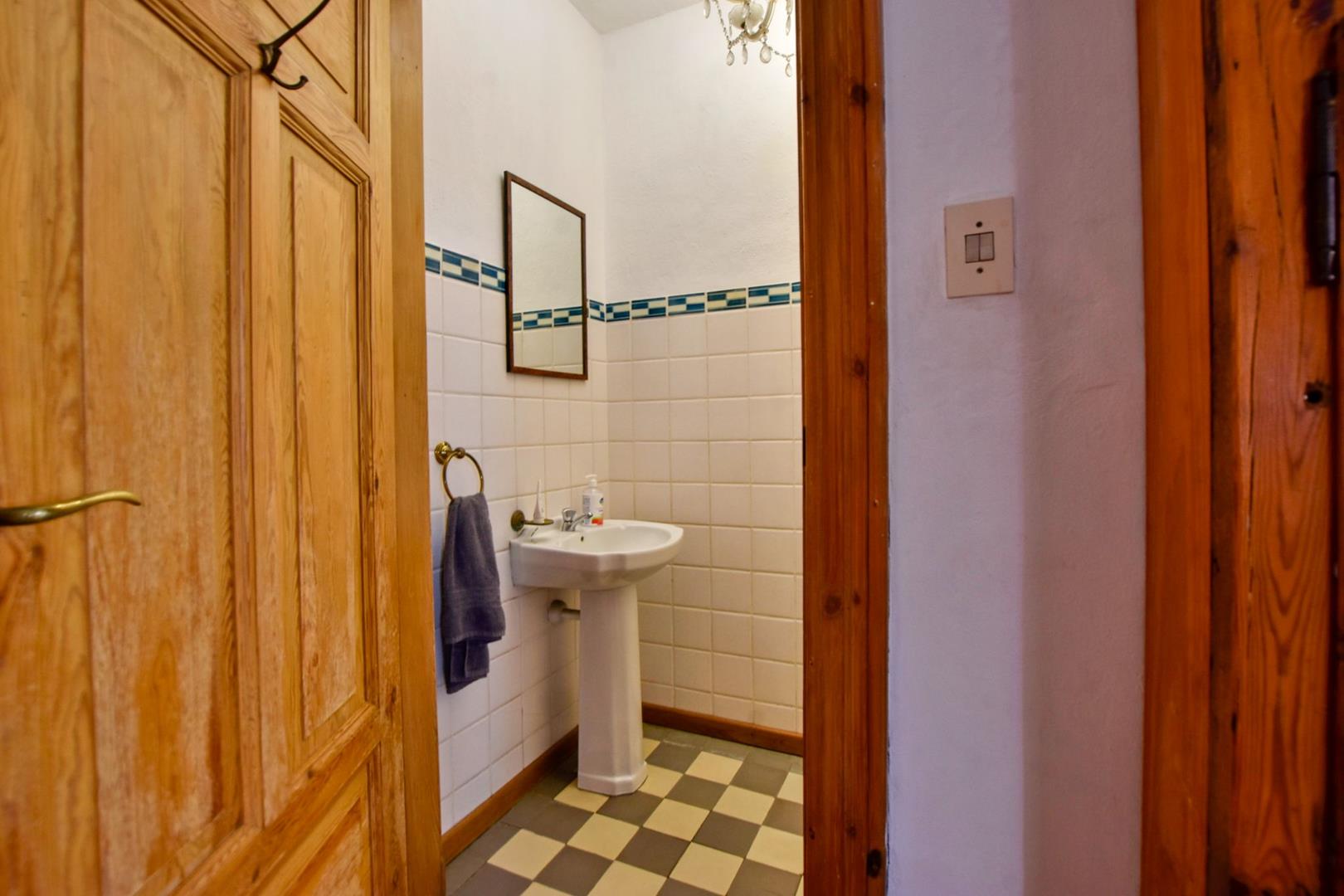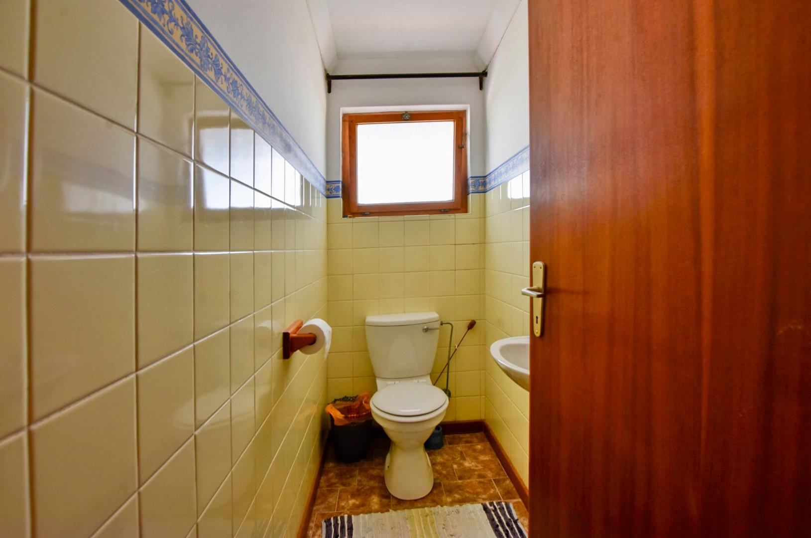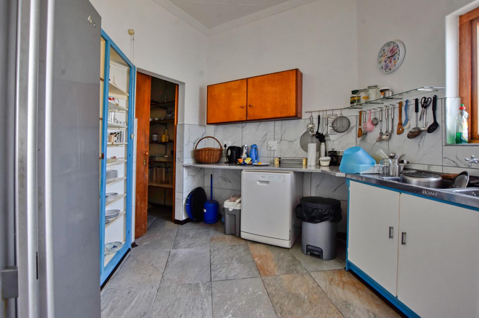 The ground floor comprises of: Entrance, lounge with fireplace, covered stoep, kitchen with built-in cupboards and fitted appliances, pantry, laundry, passage with linen cupboards, three bedrooms without any built-in cupboards, bathroom with bath and hand washbasin, separate shower, and hand washbasin, as well as separate WC and hand washbasin. Furthermore, there is bachelor type cottage comprising: living area and bedroom, kitchenette, bathroom with bath, WC, and hand washbasin.