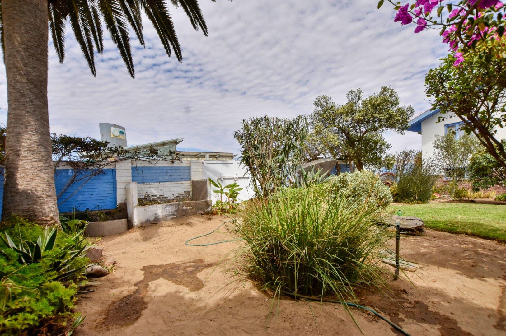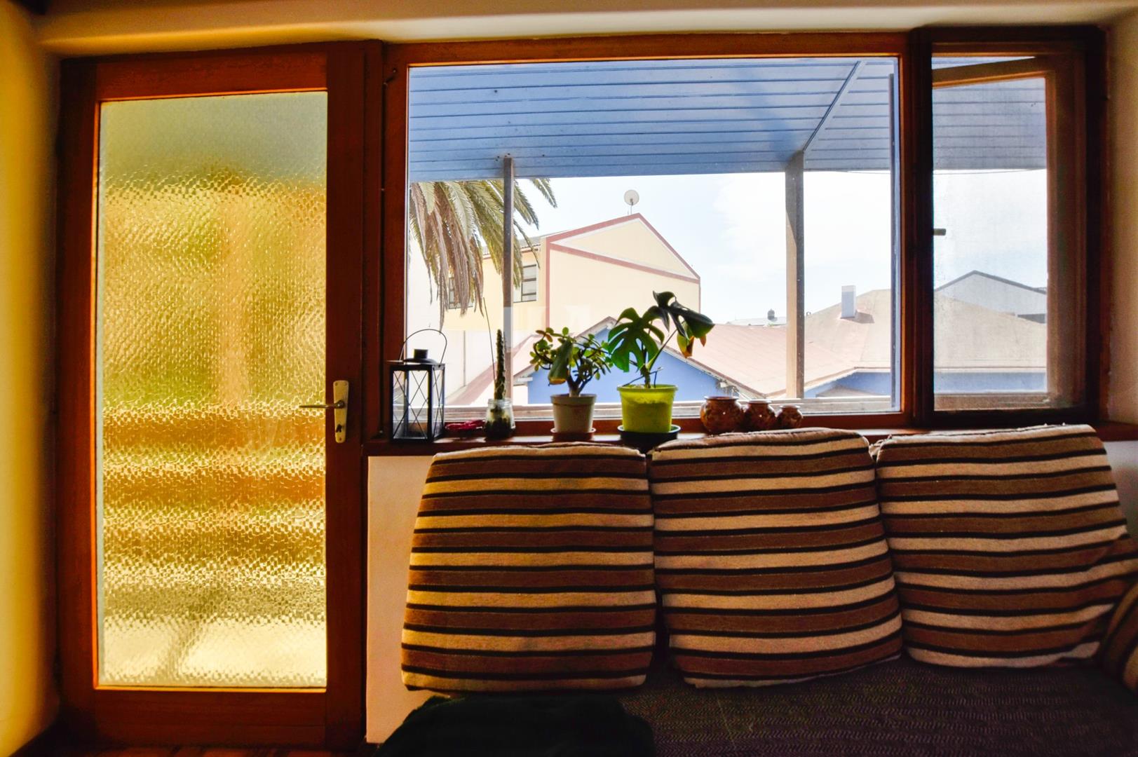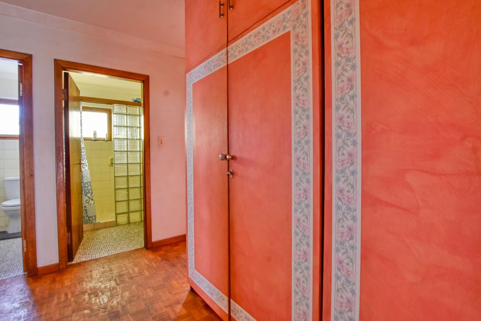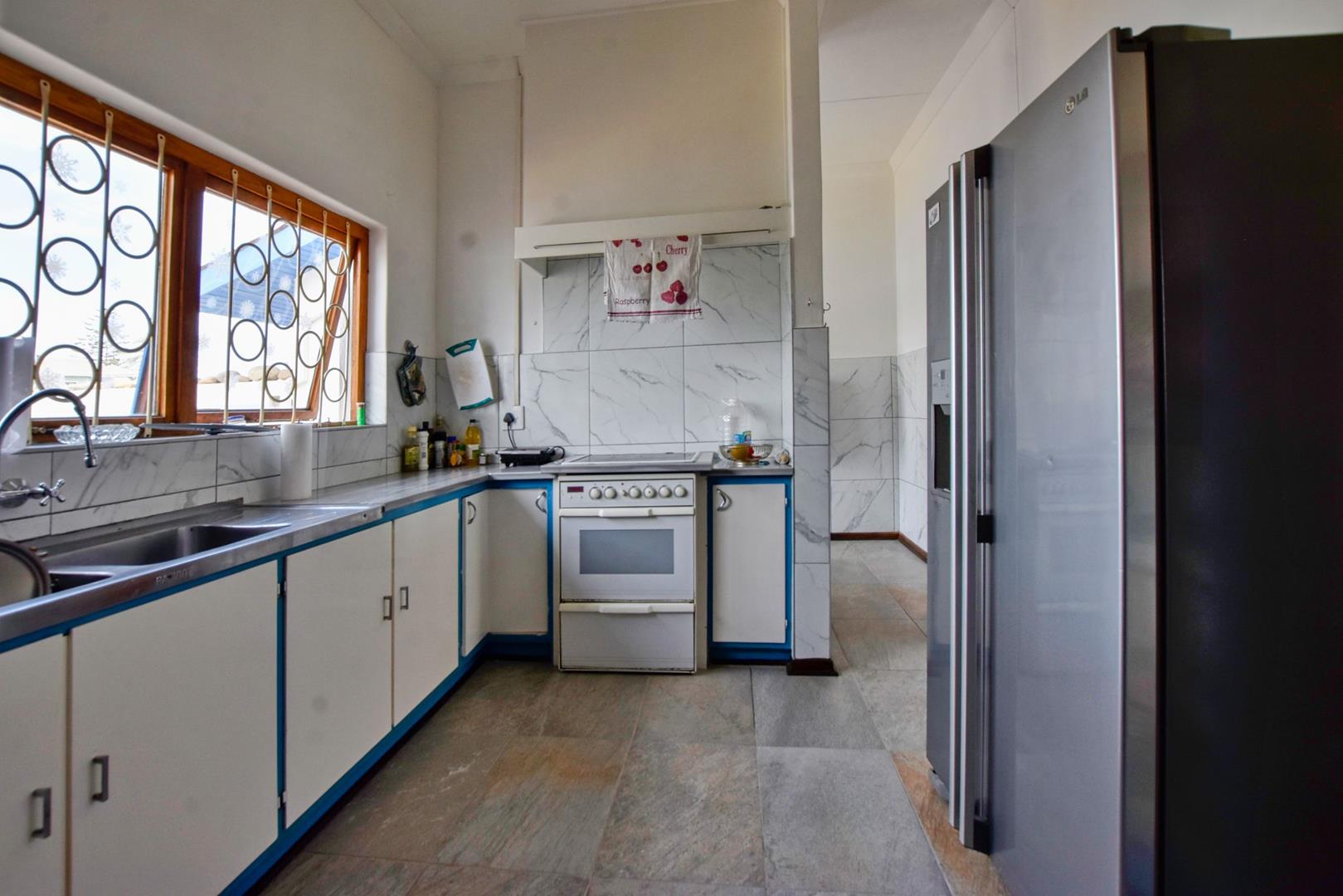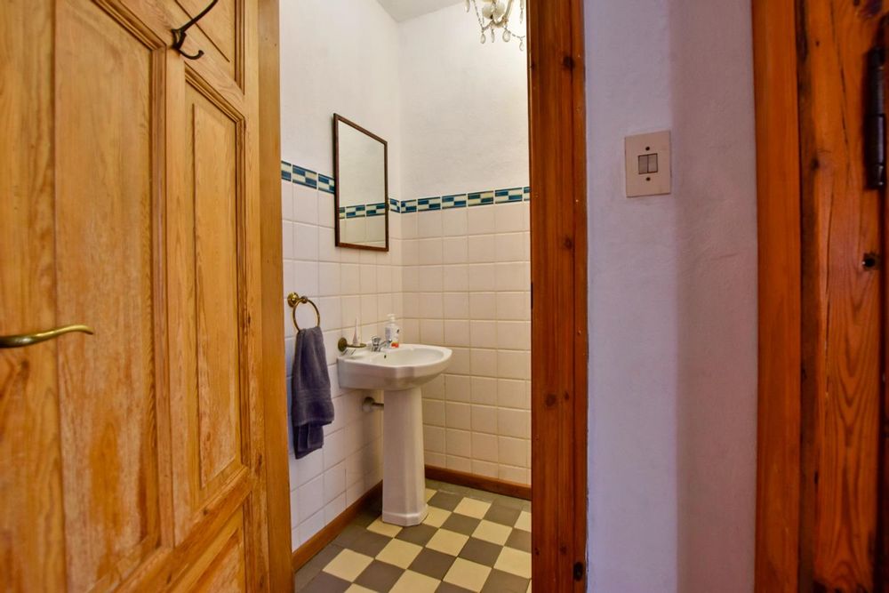 The ground floor comprises of: Entrance, lounge with fireplace, covered stoep, kitchen with built-in cupboards and fitted appliances, pantry, laundry, passage with linen cupboards, three bedrooms without any built-in cupboards, bathroom with bath and hand washbasin, separate shower, and hand washbasin, as well as separate WC and hand washbasin. Furthermore, there is bachelor type cottage comprising: living area and bedroom, kitchenette, bathroom with bath, WC, and hand washbasin.