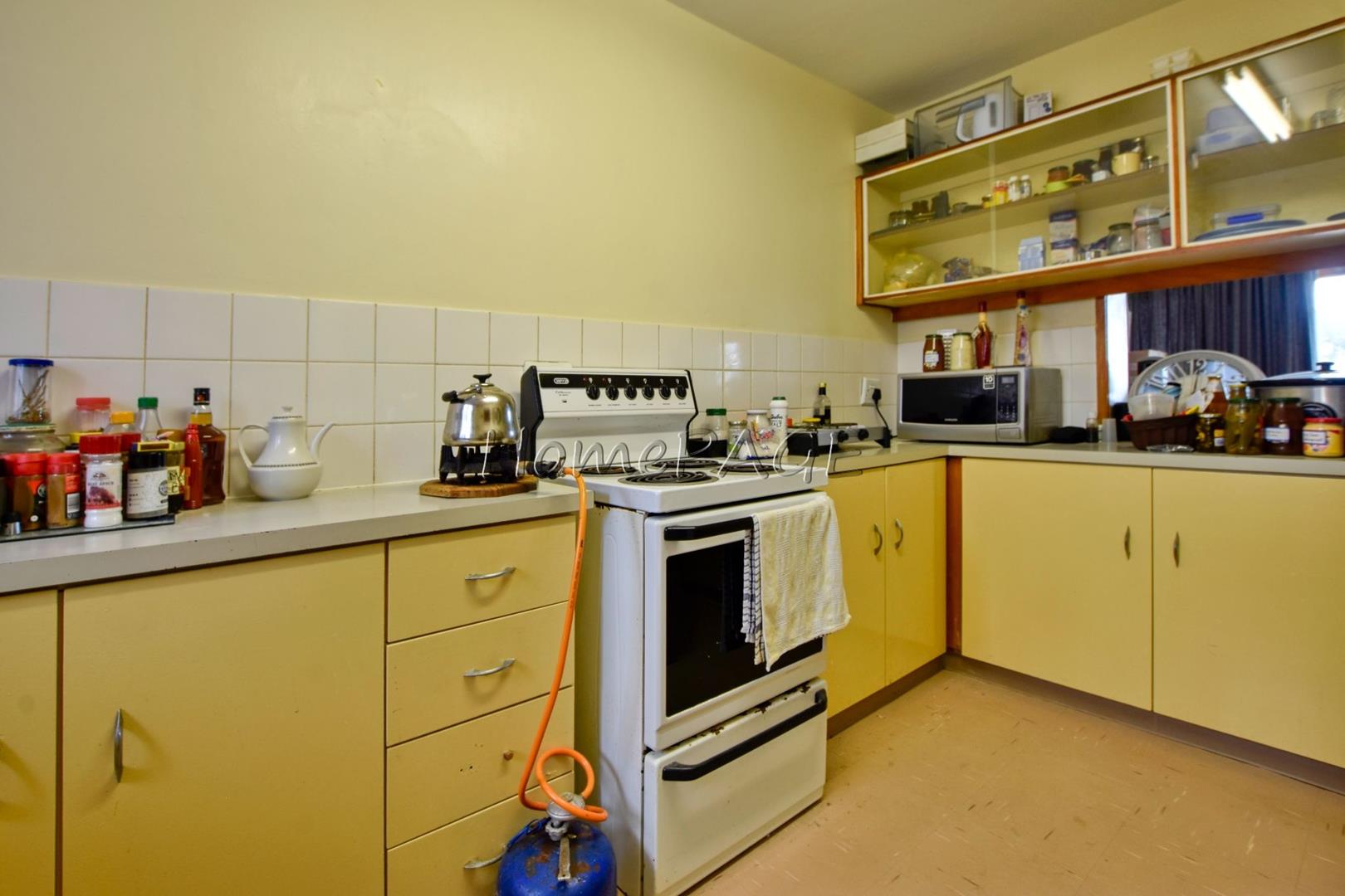 * An older, but neat, kitchen, with a serving hatch to dining room area