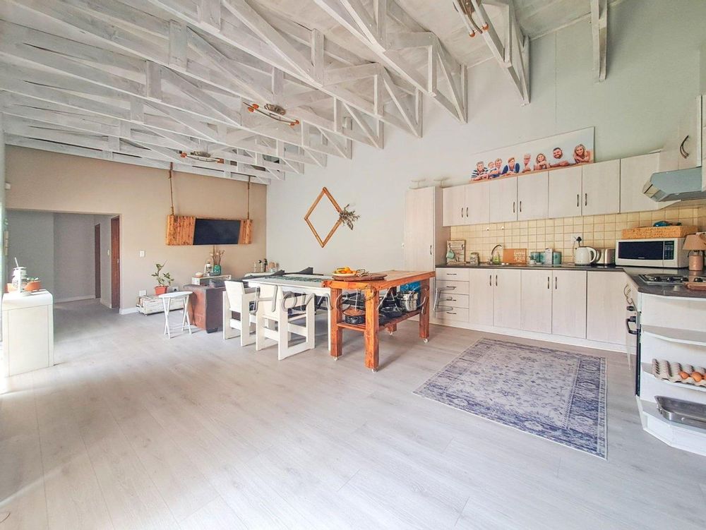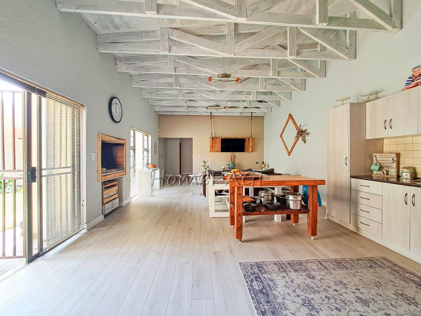 * Large living area, with high ceilings with wood trusses, open plan with kitchen